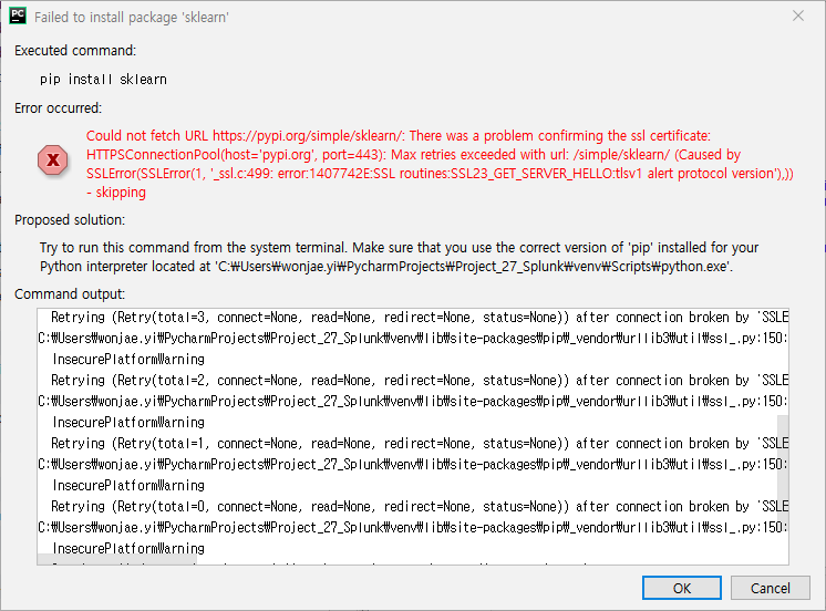 Could not fetch URL https://pypi.org/simple/sklearn/: There was a problem confirming the ssl certificate: HTTPSConnectionPool(host='pypi.org', port=443): Max retries exceeded with url: /simple/sklearn/ (Caused by SSLError(SSLError(1, '_ssl.c:499: error:1407742E:SSL routines:SSL23_GET_SERVER_HELLO:tlsv1 alert protocol version'),)) - skipping