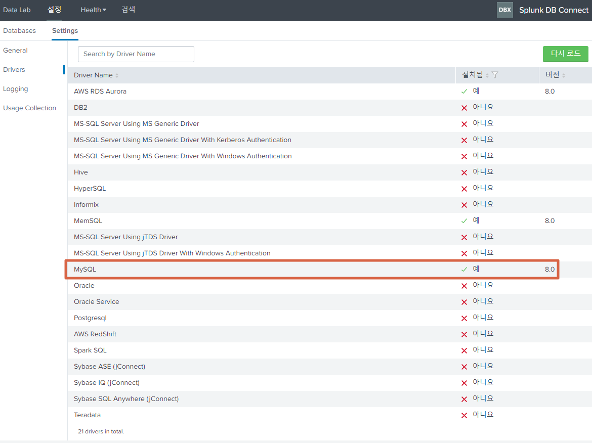 아래는 각 dbms 드라이버가 설치 되어 있는지 확인할 수 있다.