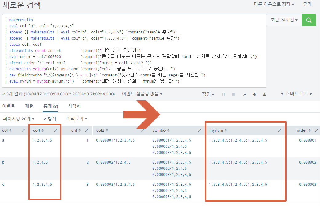 | eventstats values(col2) as combo `comment("col2 내용을 모두 하나로 묶는다. ")`