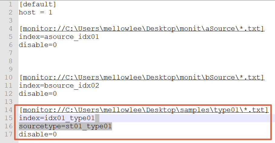 [monitor://C:\Users\mellowlee\Desktop\samples\type01\*.txt]